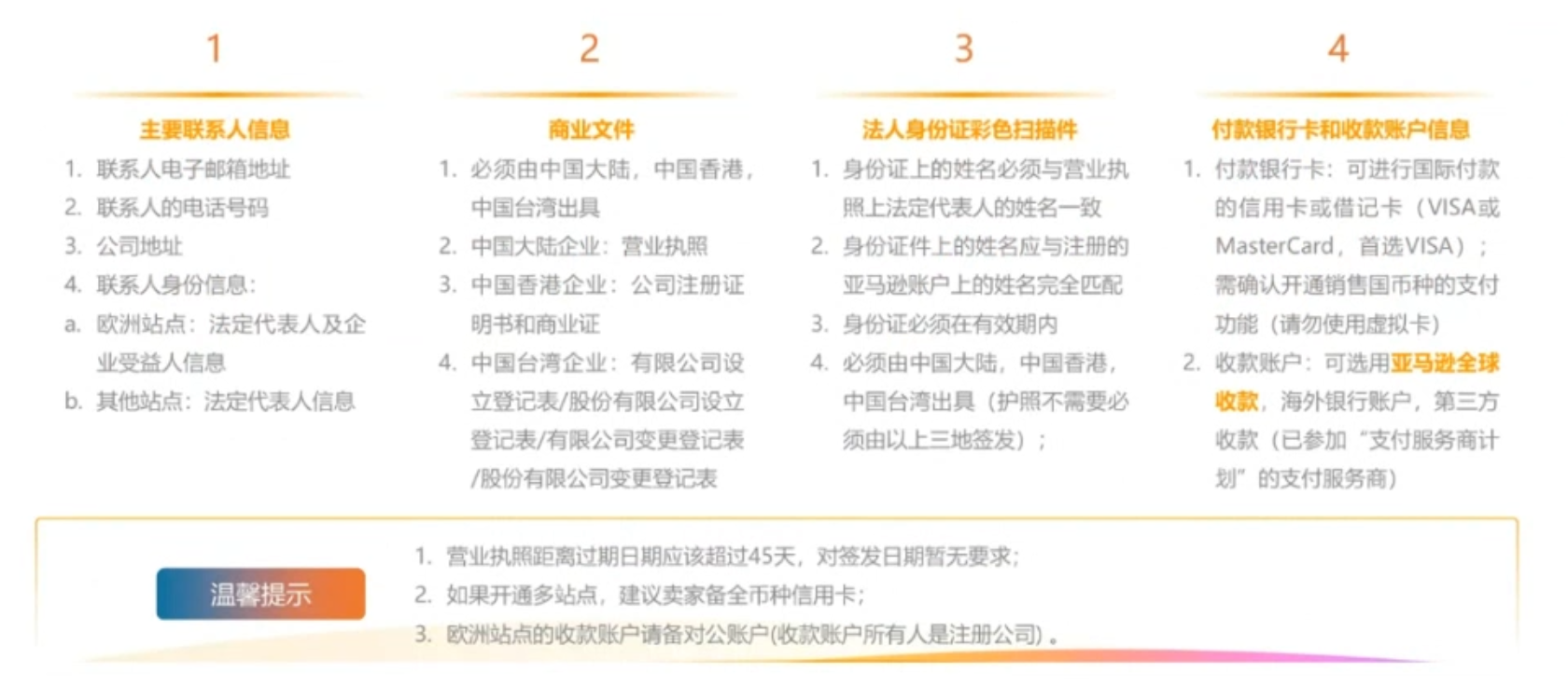 1. 基础要求:可使用营业执照正本或副本,无经营范围限制(即使执照未显示经营范围也可);执照距离过期日期需超过45天,注册成功后即可用于亚马逊店铺注册;严禁使用个体工商户营业执照。